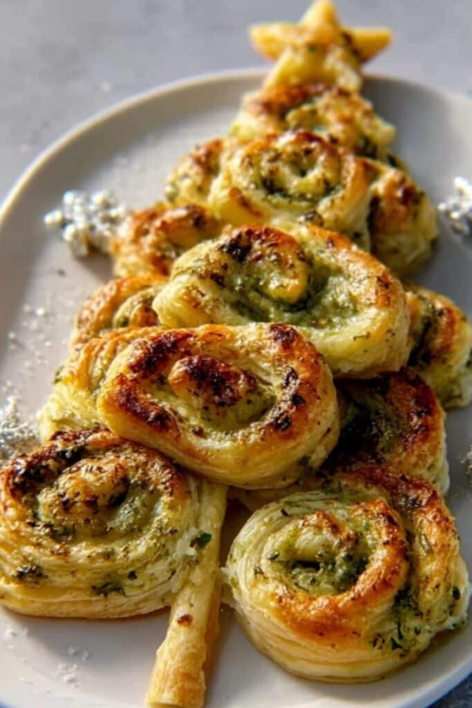 Serve your Basil Pesto Cheesy Puff Pastry Christmas Tree on a large wooden board or a marble platter with small dipping bowls on the side—marinara, garlic butter, or even whipped ricotta. Let guests pull their own branches; it’s fun, interactive, and minimizes mess.