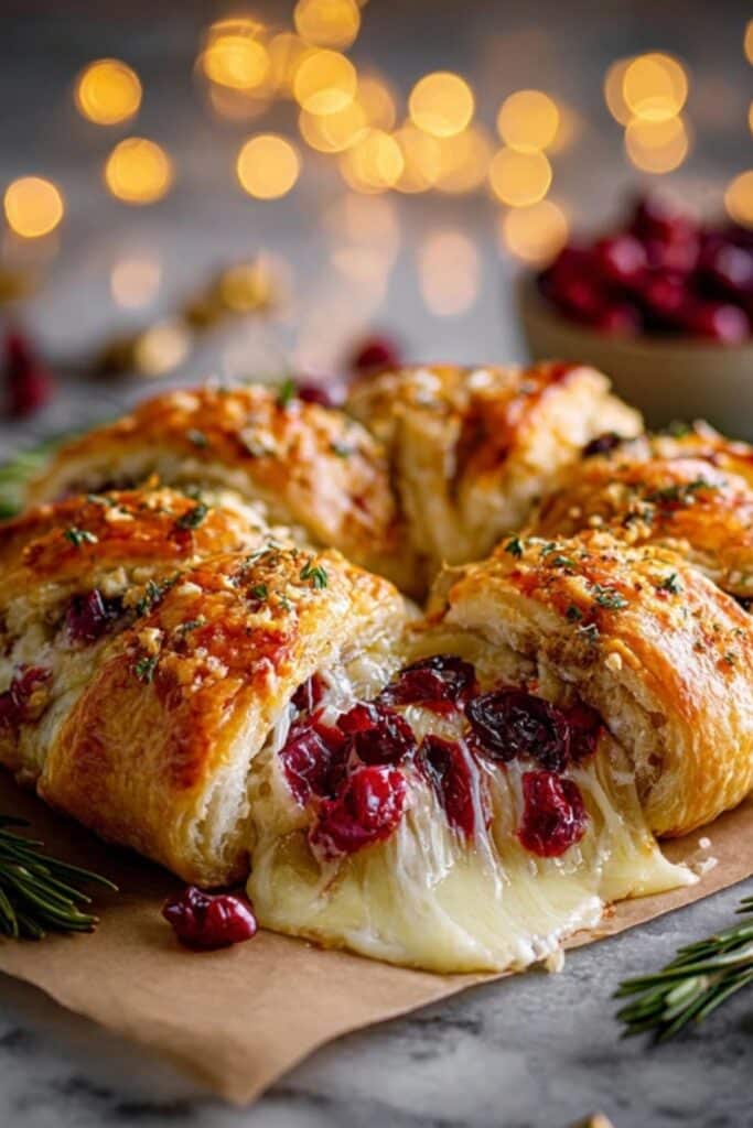 It’s not just about flavor — the wreath shape transforms this into a show-stopping centerpiece. Each golden crescent roll triangle surrounds a pocket of melty brie and bright cranberry, braided into a circle that screams Christmas. You can even tuck in fresh rosemary sprigs after baking for that pine-needle illusion.