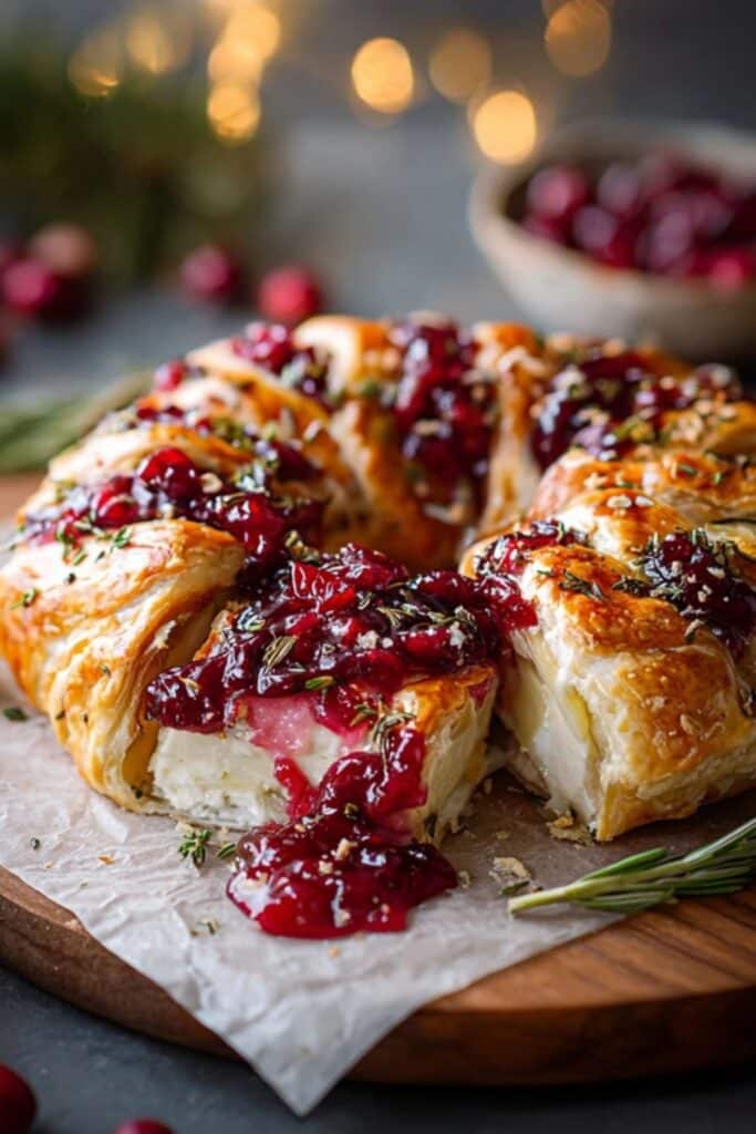 To start, unroll crescent dough triangles around the edge of a parchment-lined baking sheet, overlapping them to form a circle — points facing outward. Place brie chunks near the inner edge, top with cranberry sauce, and fold the outer points over, tucking under. Bake until golden brown and bubbly.