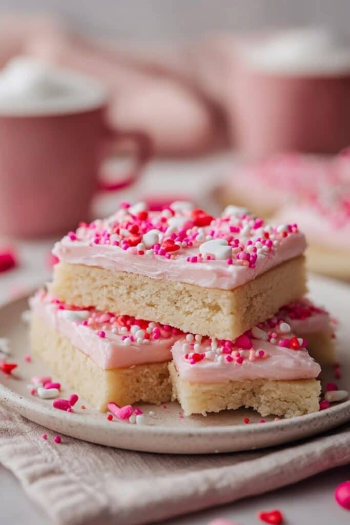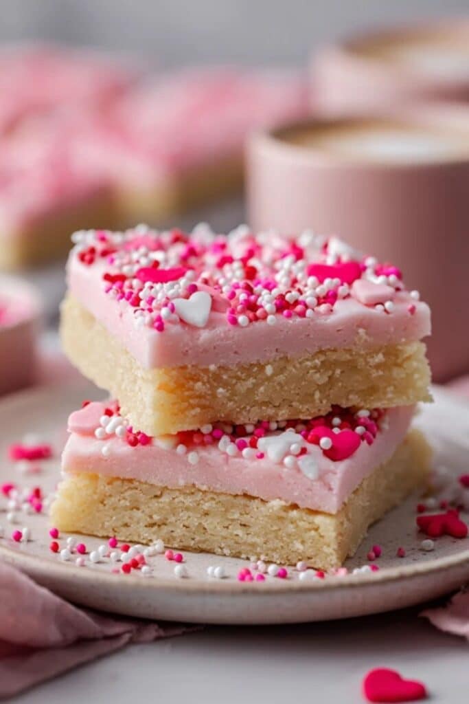 Chewy Valentine Sugar Cookie Bars don’t need the fridge for short-term storage. You can keep them in an airtight container at room temperature for 2–3 days. If your kitchen feels very warm or humid, you can refrigerate them, but then you should let the bars sit out so they soften before serving.