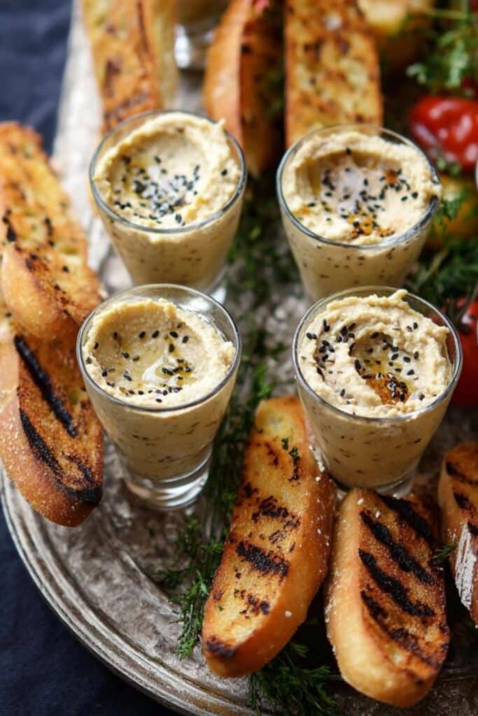 Once you get the basics down, it’s time to have fun with Everything Bagel Hummus Shots. Think of them as the hummus version of a sundae bar. You can set out different bases, toppings, and textures and let guests build their own shot.
