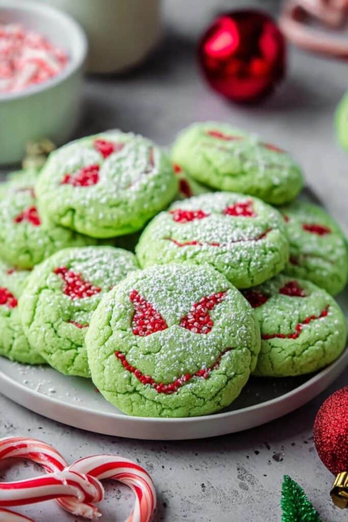Some people go the extra mile and use cream cheese frosting between two cookies to make sandwich-style Grinch Cookies. Others turn them into Grinch Cookie Bars for easy cutting and serving. You can even bake them in muffin tins for Grinch Cookie Cups — perfect bite-sized party treats.