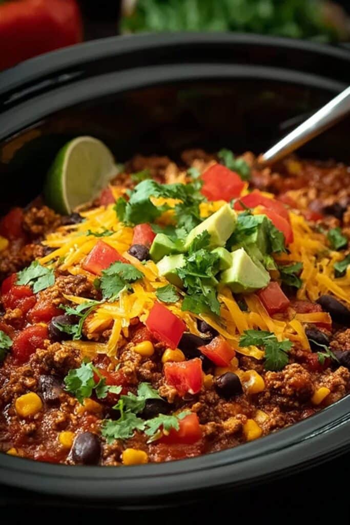 You’ll brown your meat first, then stir in the seasoning, salsa, beans, and corn. Once combined, you’ll start layering it in your slow cooker like a lasagna: meat mixture, tortilla layer, cheese—repeat. Cook on low for 4–5 hours or high for 2–3, until bubbly and melty. Some folks even add crushed tortilla chips for crunch, much like the texture-packed Pizza Tot Casserole.