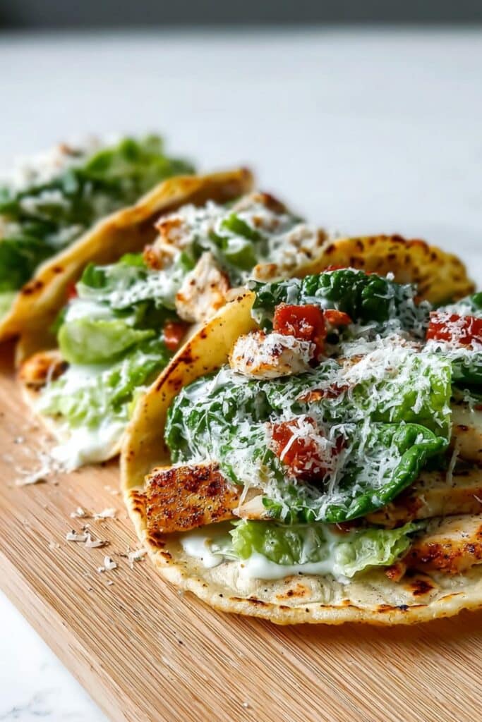 Want crunch? Crushed garlic croutons bring that classic Caesar texture right into the taco. A sprinkle of chili flakes or a few pickled jalapeños adds heat that balances the creamy dressing.
